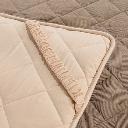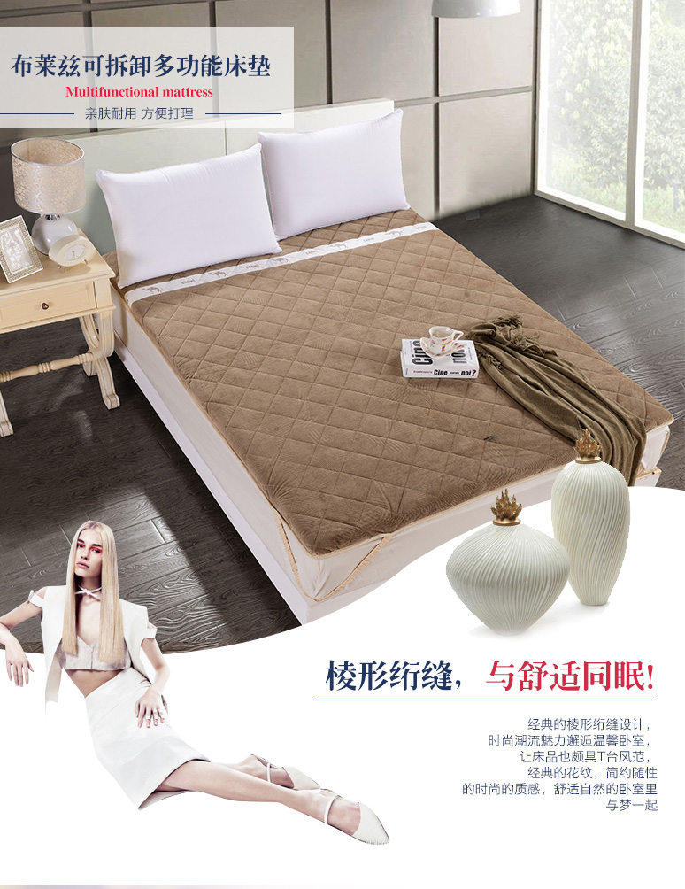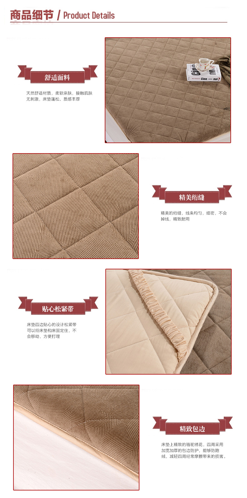 工藝:床墊上精致的駱駝繡花,四周采用加寬加厚的包邊防護(hù),能夠防跑絨,減輕四周經(jīng)常摩擦帶來(lái)的損害。