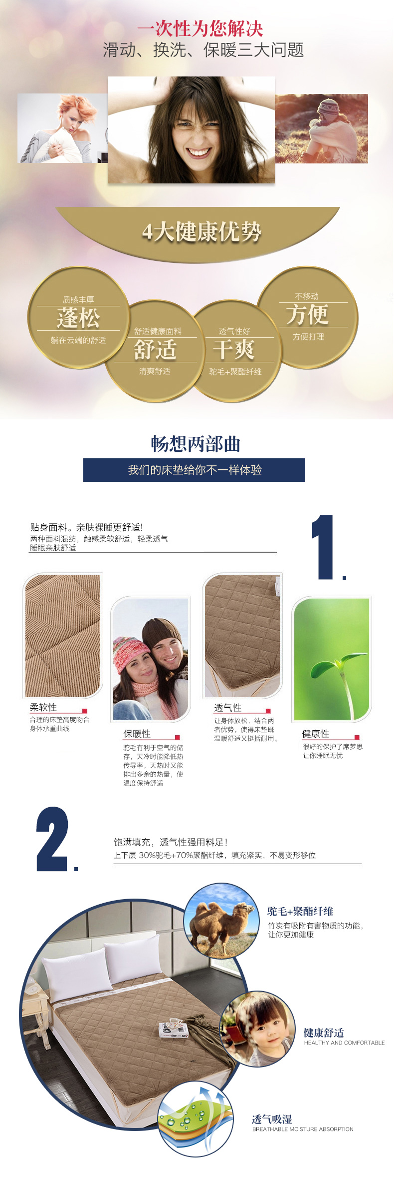 產(chǎn)品特點(diǎn):駝毛有利于空氣的儲(chǔ)存,天冷時(shí)能降低熱傳導(dǎo)率,天熱時(shí)又能排出多余的熱量,使溫度保持舒適。讓身體放松,結(jié)合兩者優(yōu)勢(shì),使得床墊既溫暖舒適又挺括耐用。