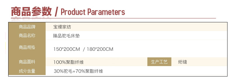 填充物:上下層 30%駝毛+70%聚酯纖維1.34kg/1.6kg 1000g/m2 100%聚酯纖維