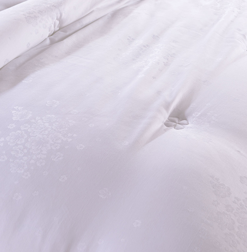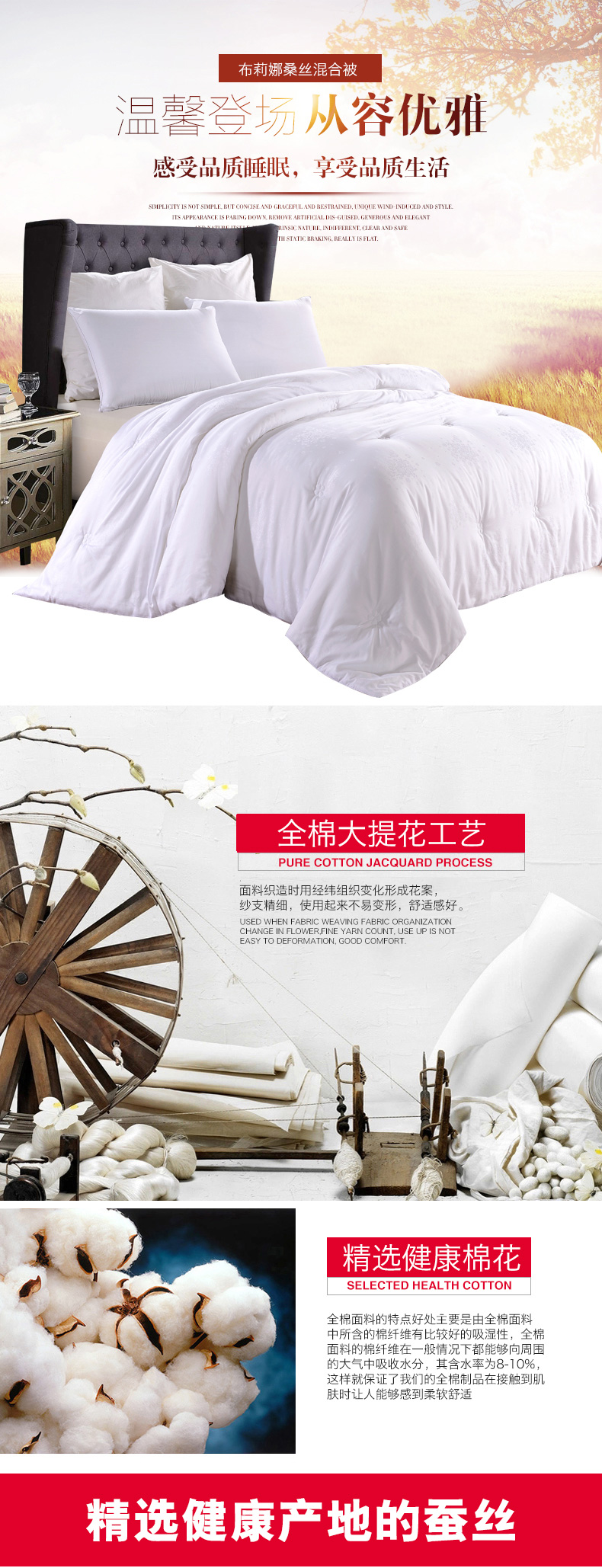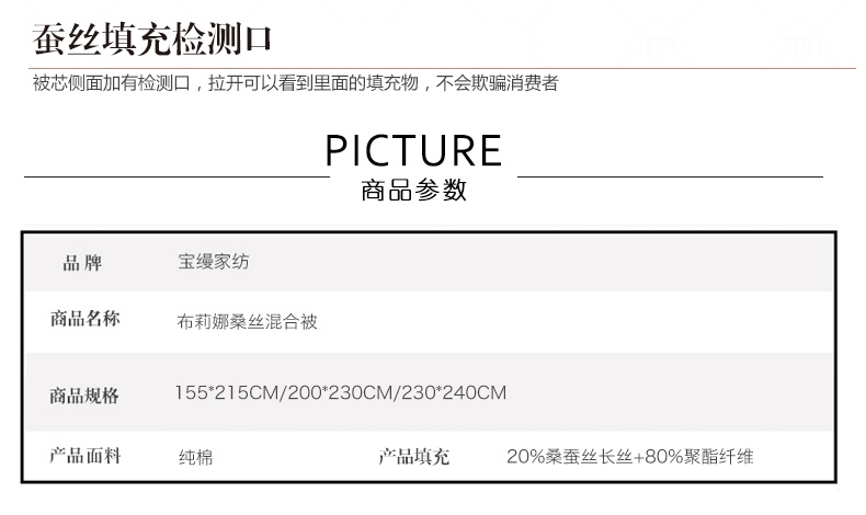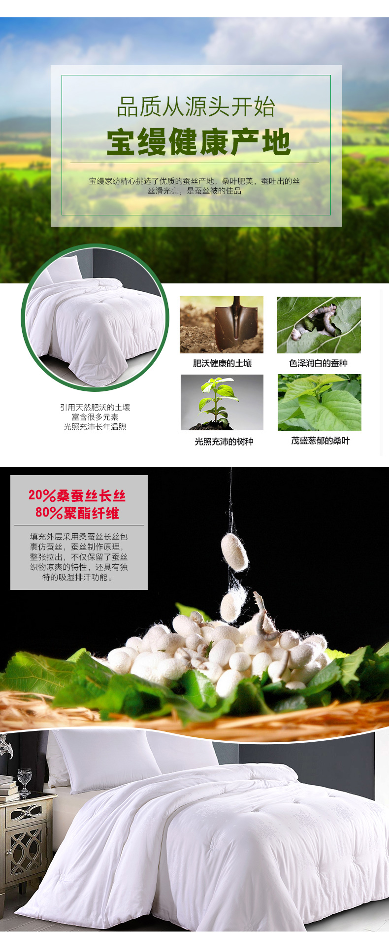 填充物:20%桑蠶絲長絲+80%聚酯纖維 1.2床:凈重1.4kg 1.5床:凈重2kg 1.8床:凈重2.4kg