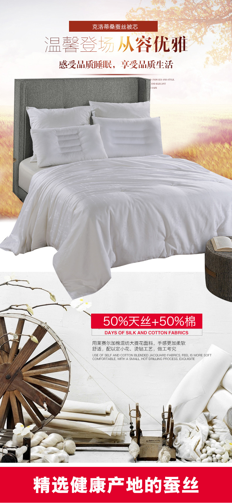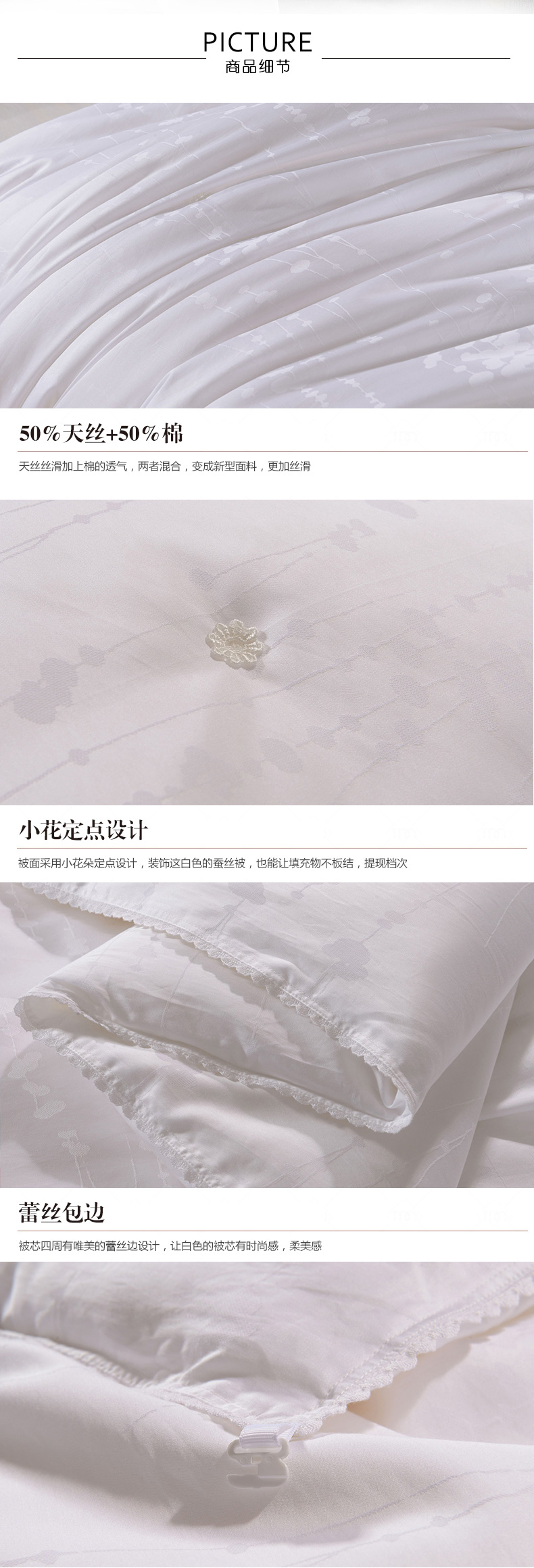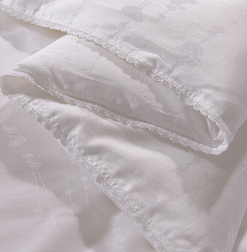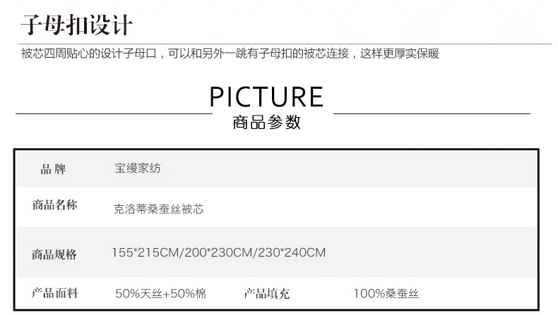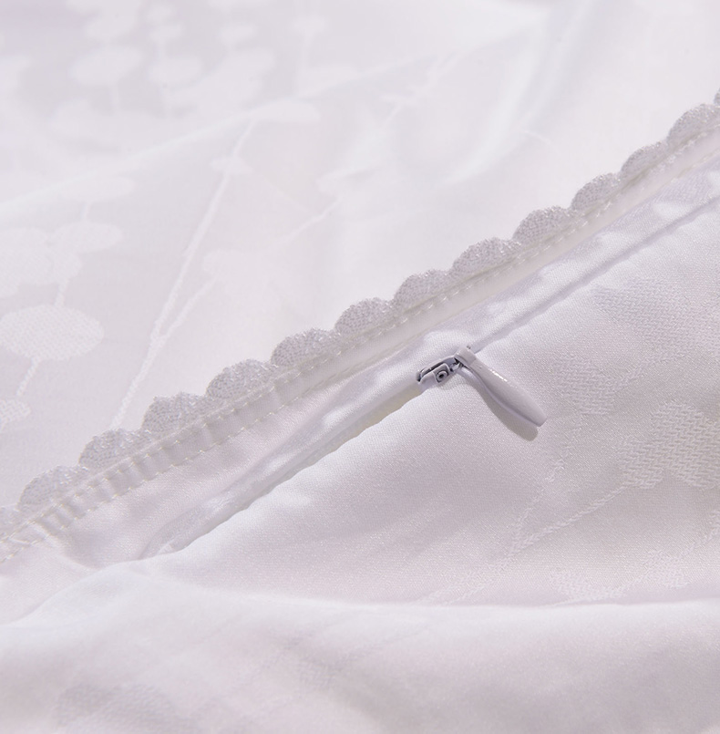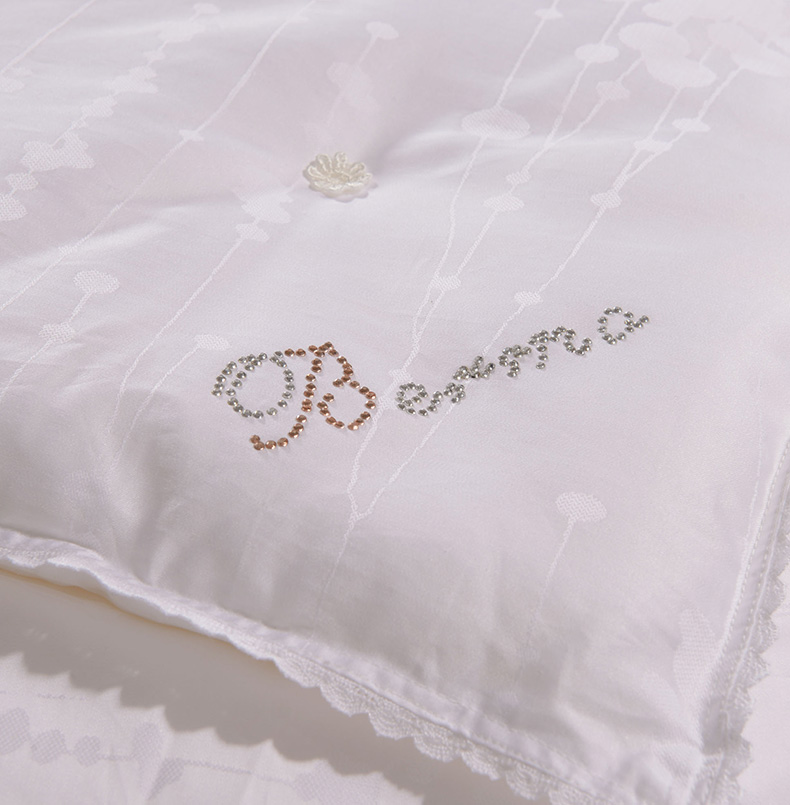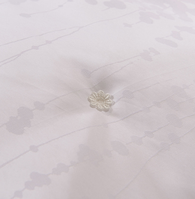 產(chǎn)品特點:采用萊賽爾加棉混紡大提花面料,手感更加柔軟舒適,配以定小花、燙鉆工藝,做工考究。填充為上等桑蠶絲長絲雙宮繭,既保暖又不宜起團(tuán),不易變形。