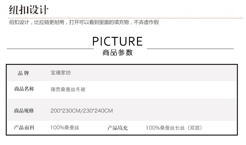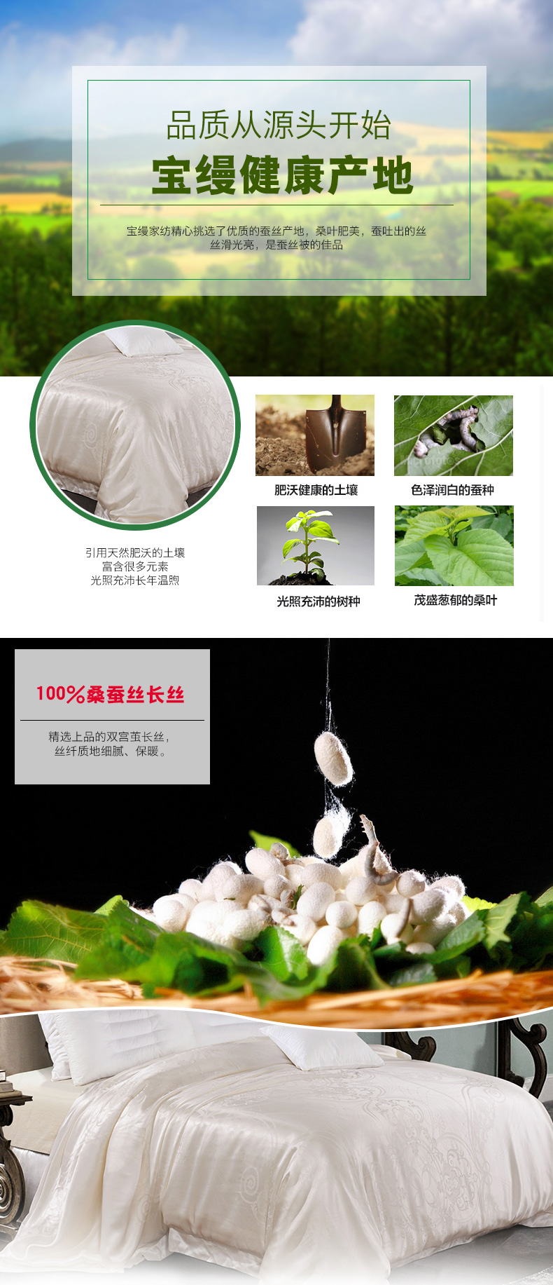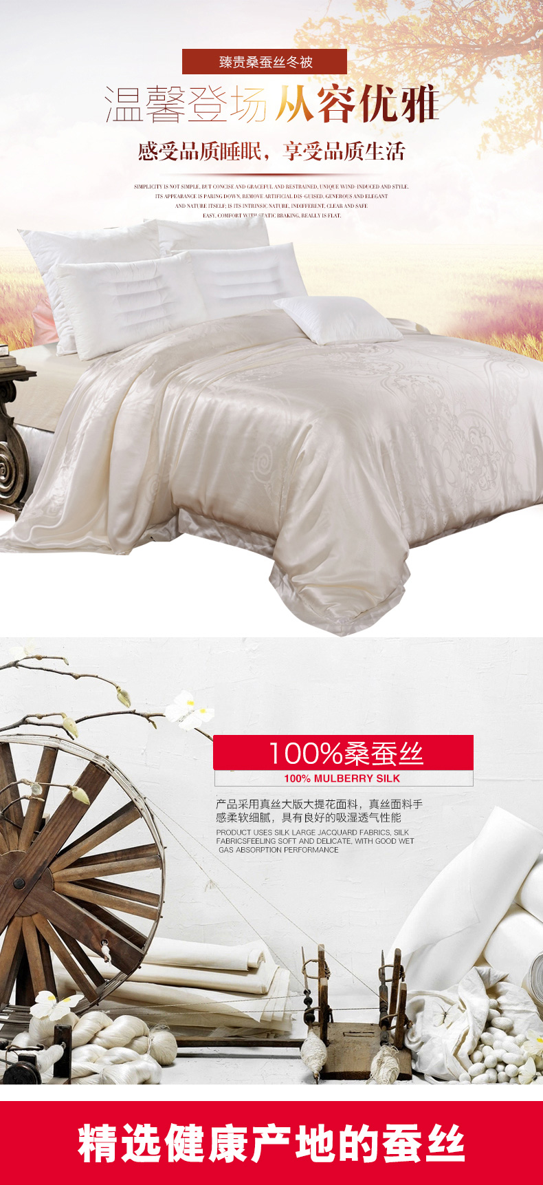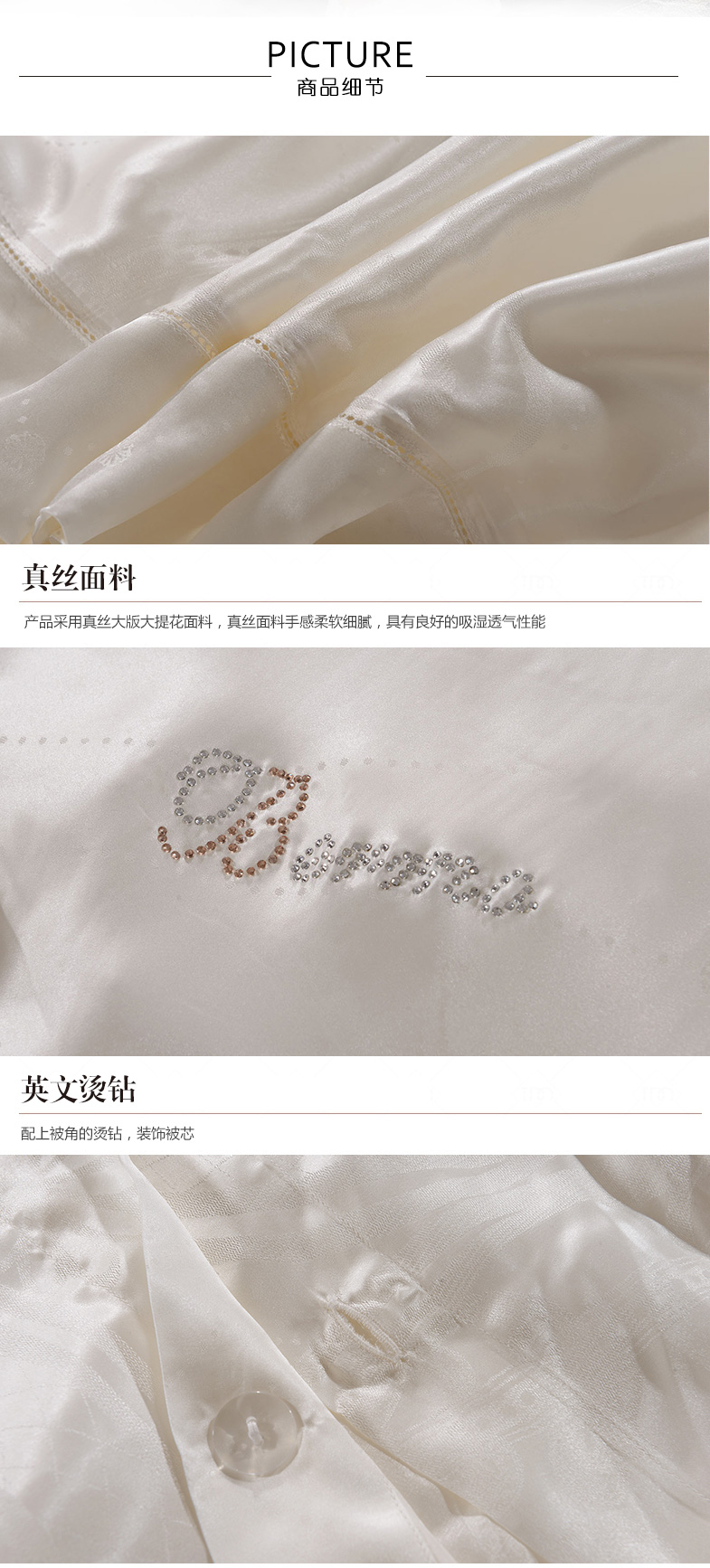 產(chǎn)品特點(diǎn):產(chǎn)品采用真絲大版大提花面料,真絲面料手感柔軟細(xì)膩,具有良好的吸濕透氣性能。精選上品的雙宮繭長絲,絲纖質(zhì)地細(xì)膩、保暖。