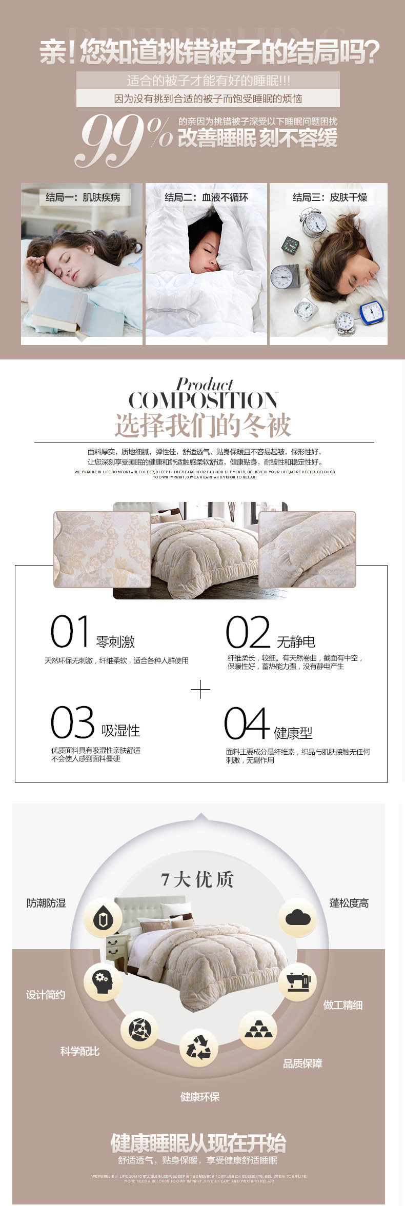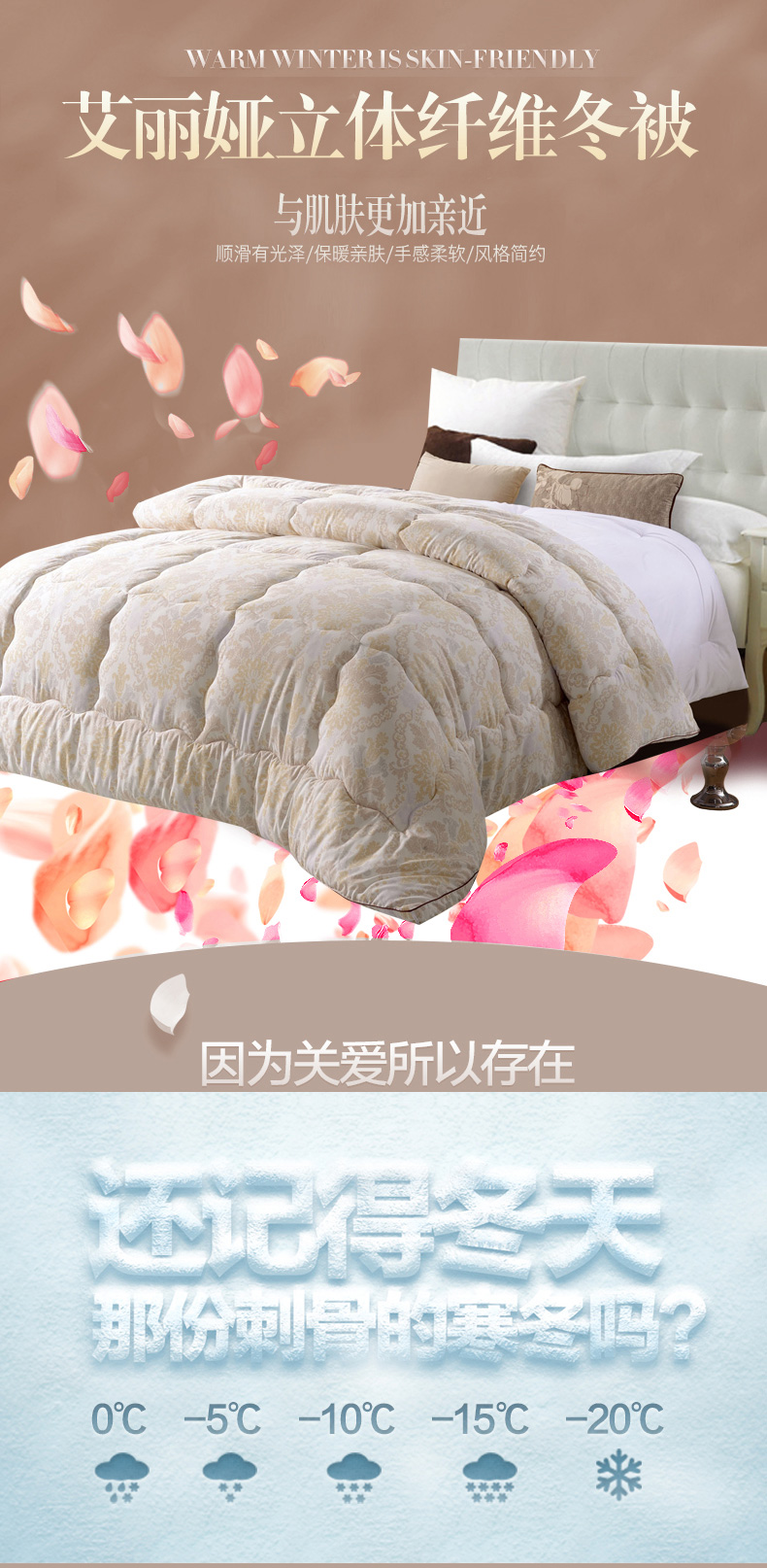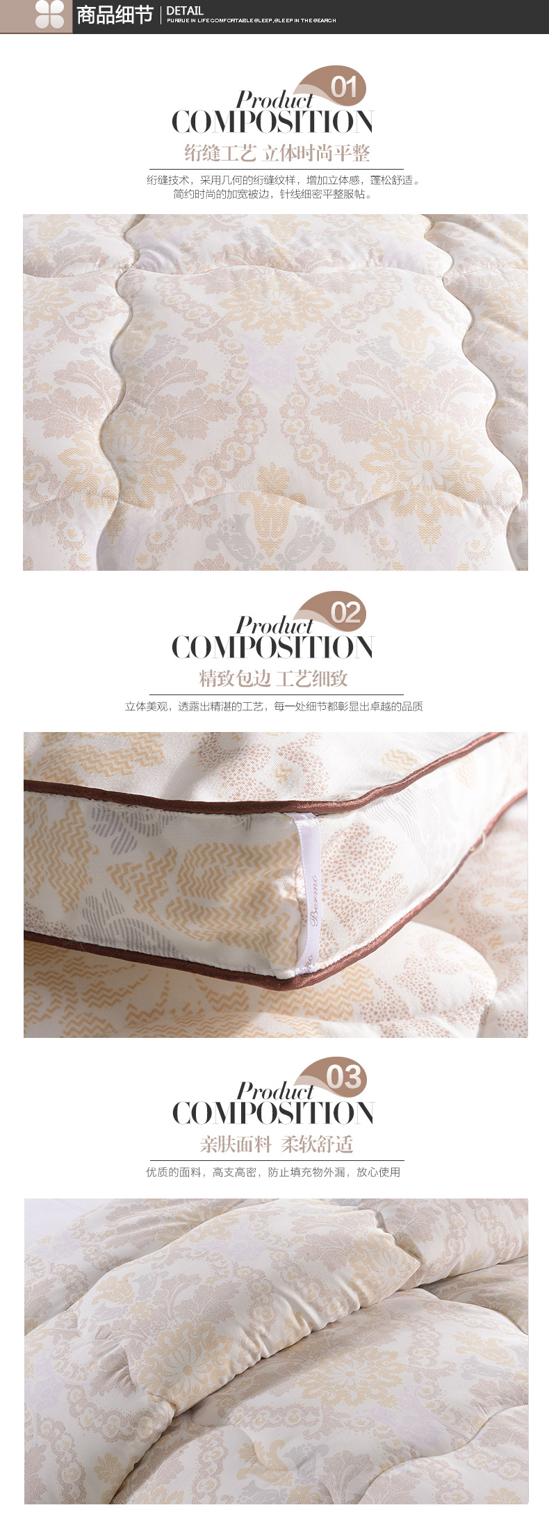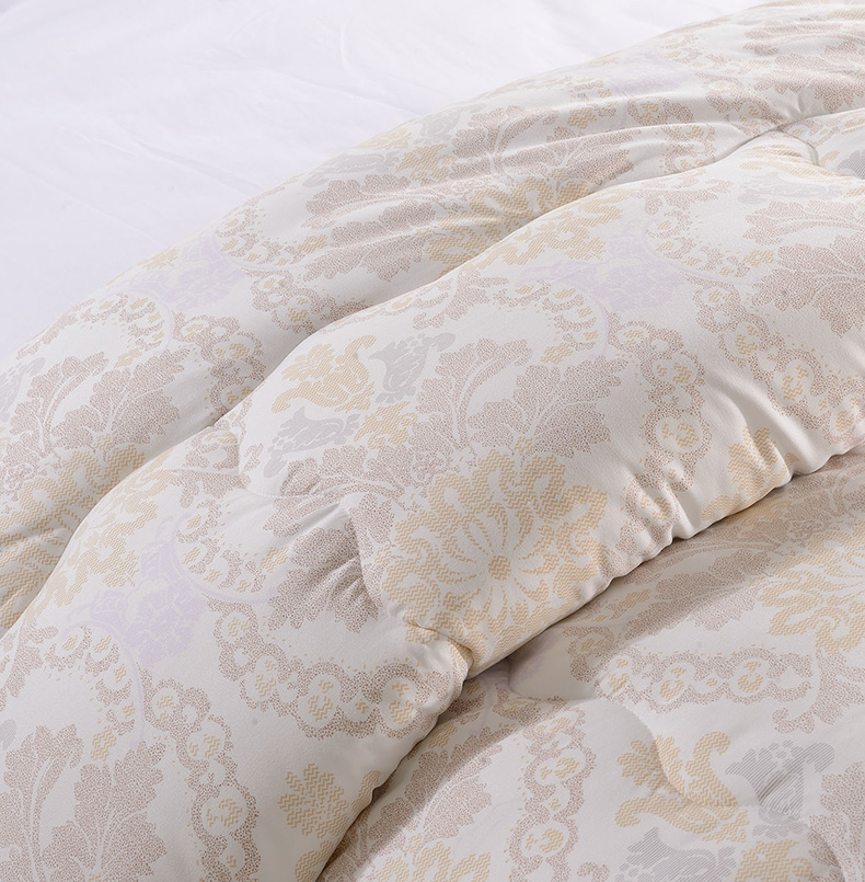 產(chǎn)品特點:精選優(yōu)質(zhì)磨毛親膚面料,輕盈保暖,超細羽絲絨填充,使被芯具有良好的保暖性。