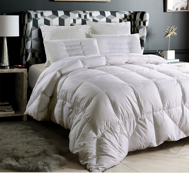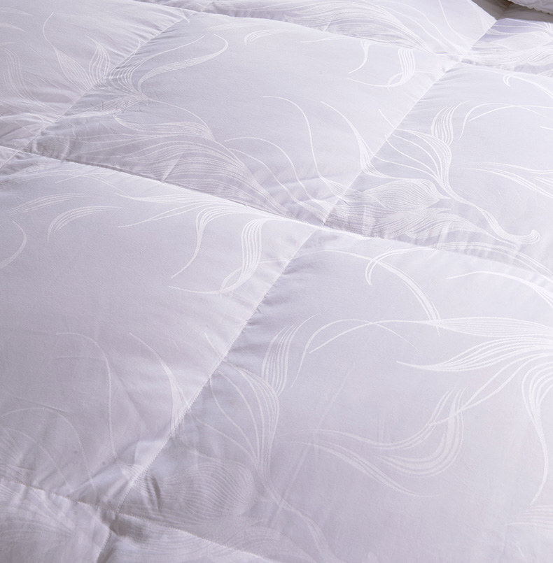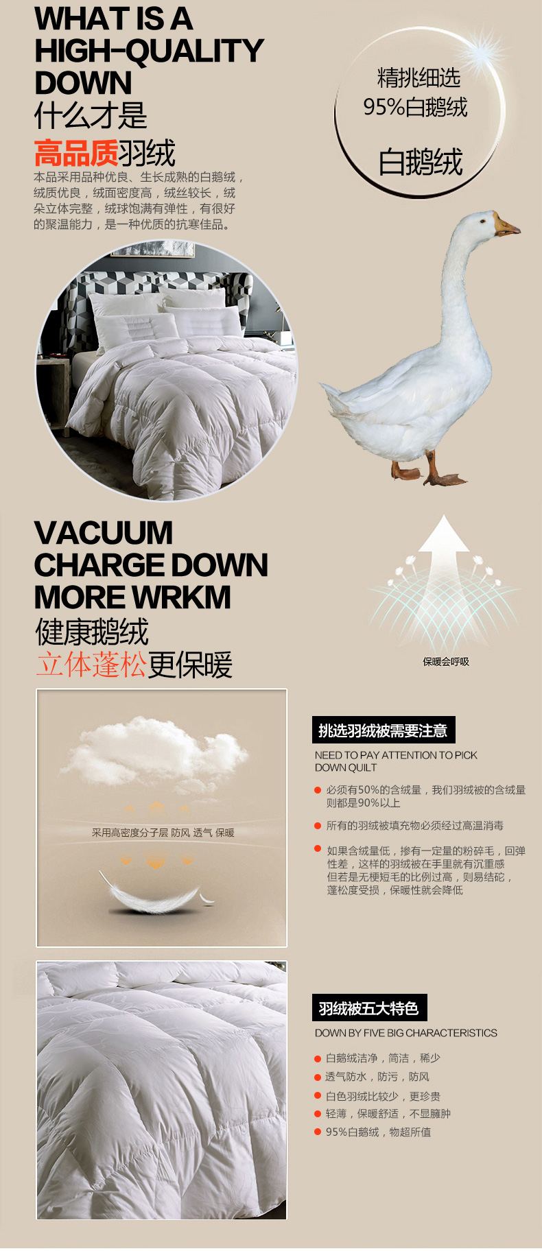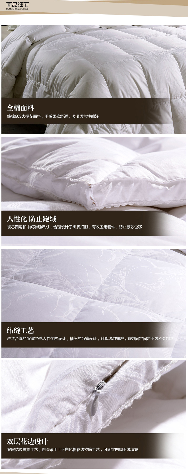 產(chǎn)品特點:純棉60S大提花面料,手感柔軟舒適,吸濕透氣性能好。填充100%白鵝絨(含絨量95%),白鵝絨輕盈蓬松,吸濕透氣性強。