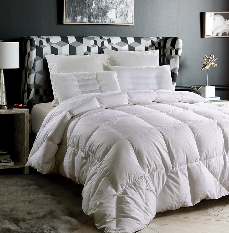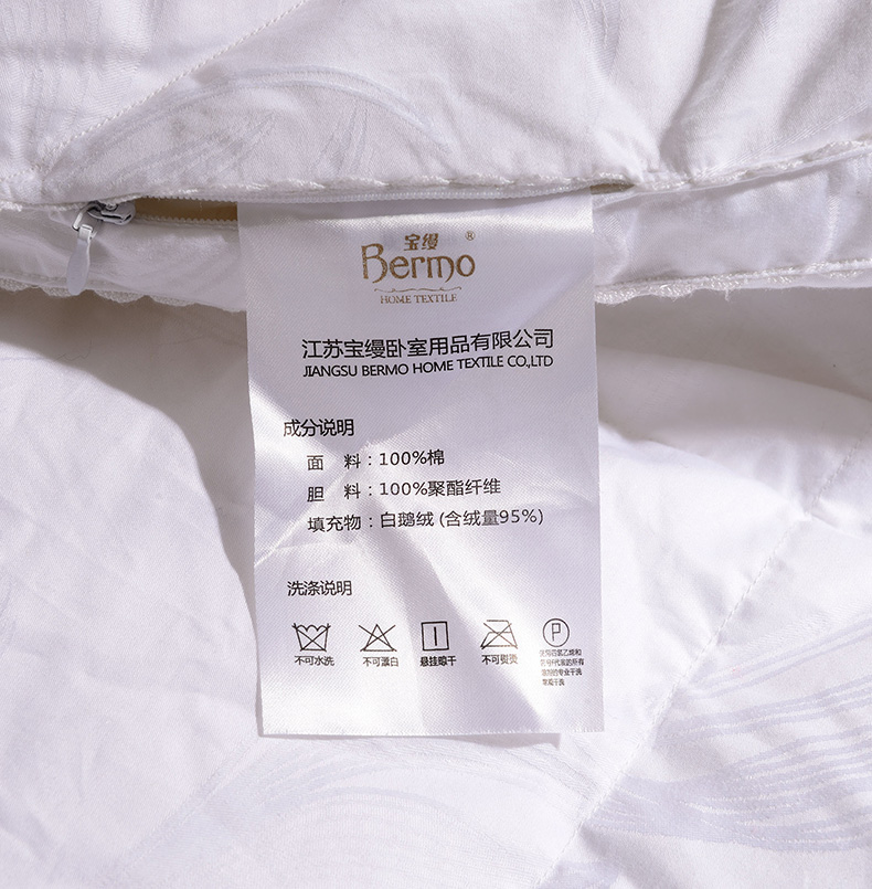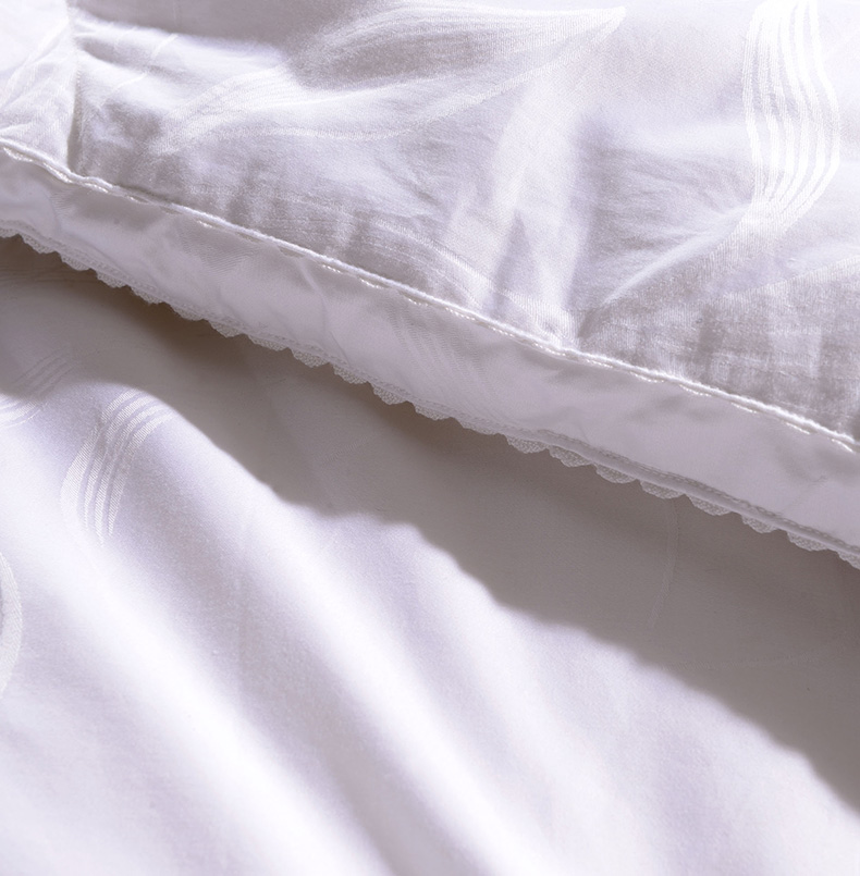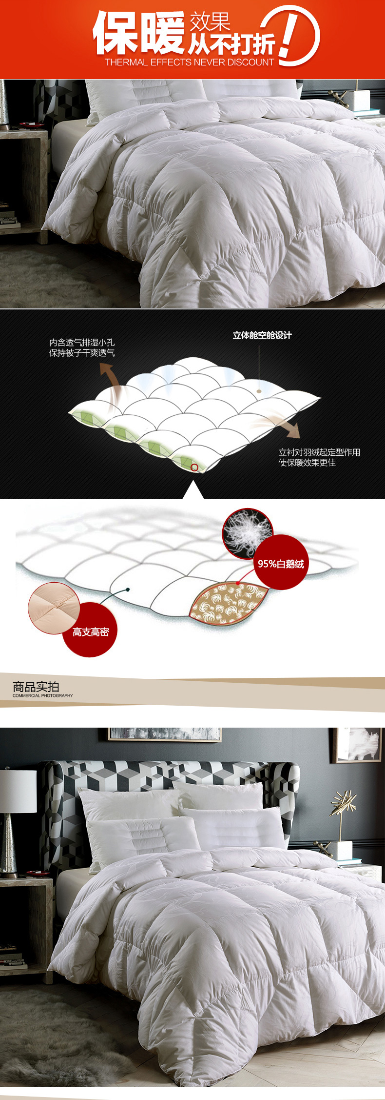 產(chǎn)品特點:純棉60S大提花面料,手感柔軟舒適,吸濕透氣性能好。填充100%白鵝絨(含絨量95%),白鵝絨輕盈蓬松,吸濕透氣性強。