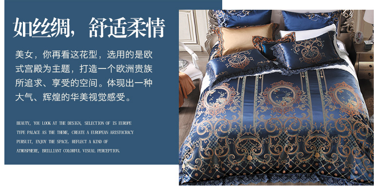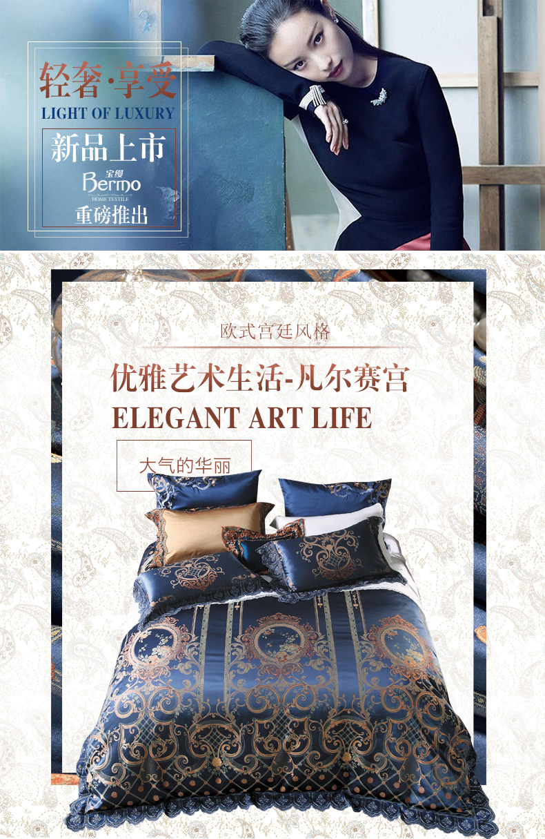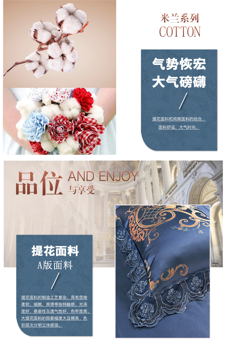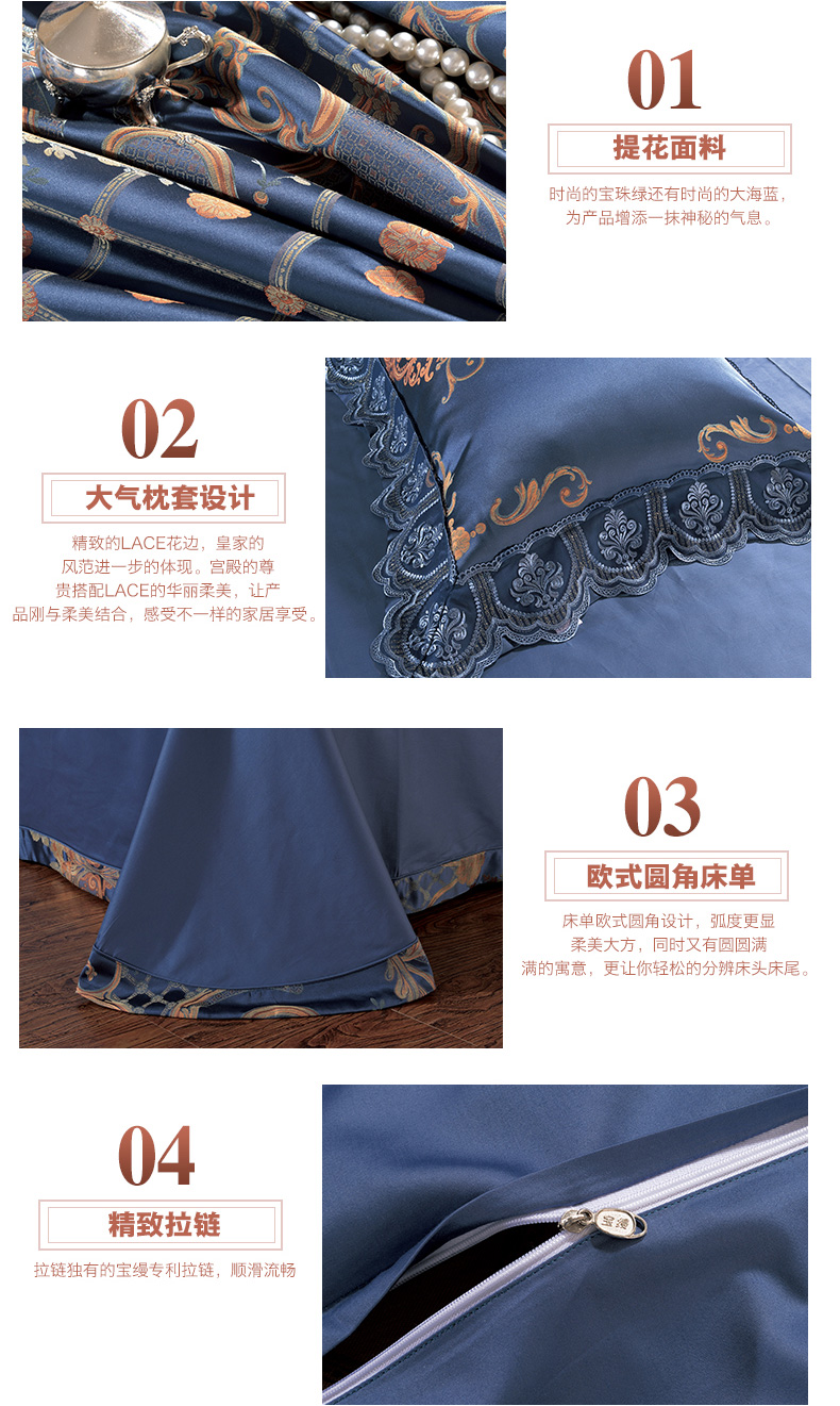 第一:產(chǎn)品特別加入精致的lace花邊,皇家的風(fēng)范進一步的體現(xiàn)。宮殿的尊貴搭配lace的華麗柔美,讓產(chǎn)品剛與柔美結(jié)合,感受不一樣的家居享受。