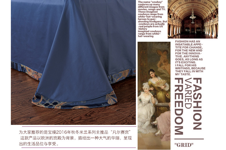 色彩生活,寶縵家紡!今天為大家推薦的是寶縵2016年秋冬米蘭系列主推品“凡爾賽宮”, 這款產(chǎn)品以歐洲的宮殿為背景,描繪出一種大氣的華麗,呈現(xiàn)出極致的生活品位與享受。產(chǎn)品選用高支高密的提花面料,其質(zhì)地細膩,柔韌性強,垂感好,光澤度可以與真絲相媲美。