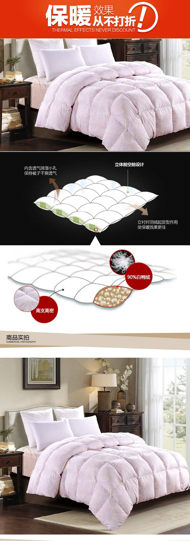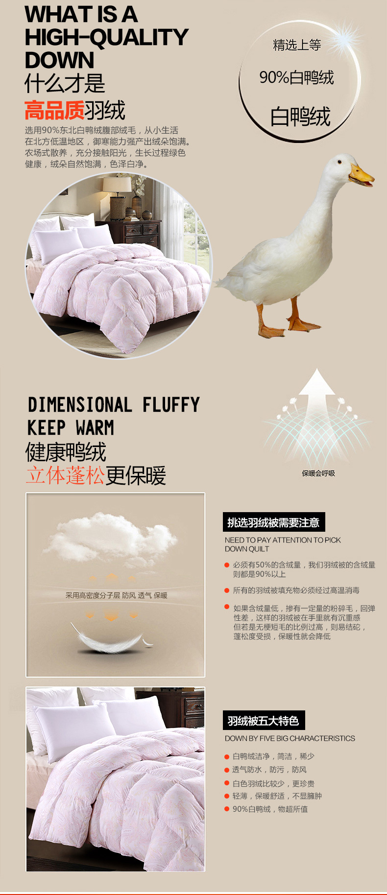 選用90%東北白鴨絨腹部絨毛,從小生活在北方低溫地區(qū),御寒能力強產出絨朵飽滿。農場式散養(yǎng),充分接觸陽光,生長過程綠色健康,絨朵自然飽滿,色澤白凈。