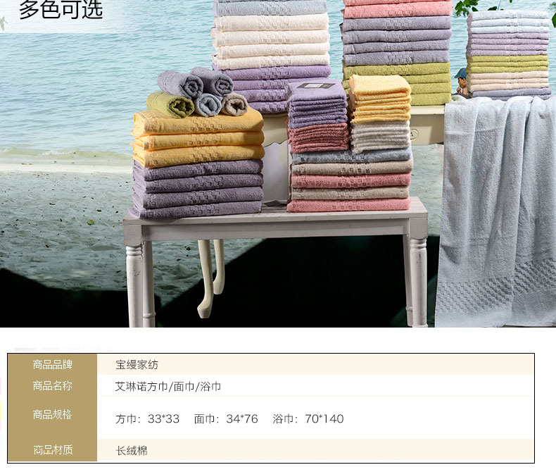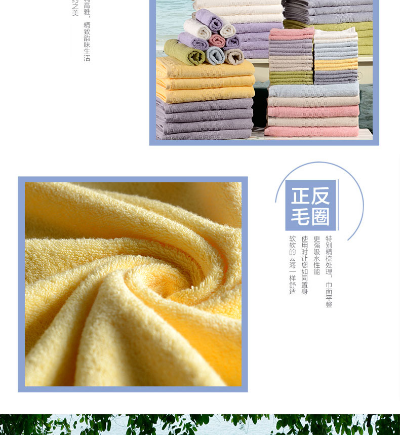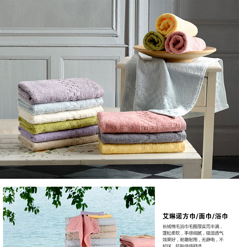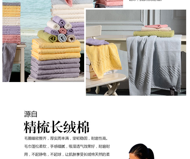 毛圈細密整齊,厚實而豐滿,堅韌穩(wěn)固,耐磨性高。毛巾蓬松柔軟,手感細膩,吸濕透氣效果好,耐磨耐用,不起靜電,不起球,讓肌膚享受長絨棉天然的柔軟度,拒絕滑膩,倍感舒適。