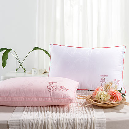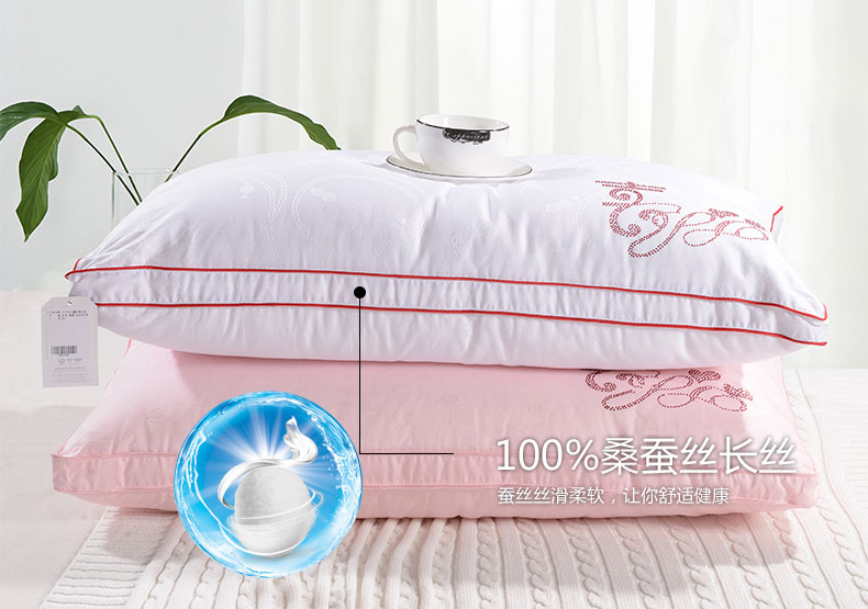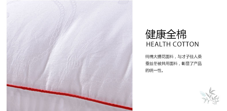 產(chǎn)品特點:純棉大提花面料,與才子佳人桑蠶絲冬被共用面料,彰顯了產(chǎn)品的統(tǒng)一性。產(chǎn)品采用內(nèi)外雙層設(shè)計,以蠶絲包裹優(yōu)質(zhì)纖維的填充形式,使得枕芯更舒適。