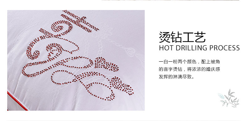 工藝:一白一粉兩個顏色,配上被角的喜字燙鉆,將濃濃的婚慶感發(fā)揮的淋漓盡致。